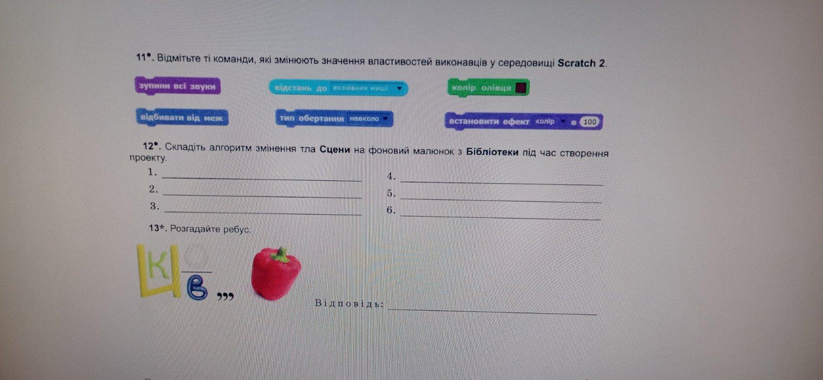 Ответ: 1:зупинити всі звуки, 2:відбивати від меж, 3:Встановити ефект коліру в 100, 4:Змінити тип обертання навколо, 5:Встановити колір олівця
