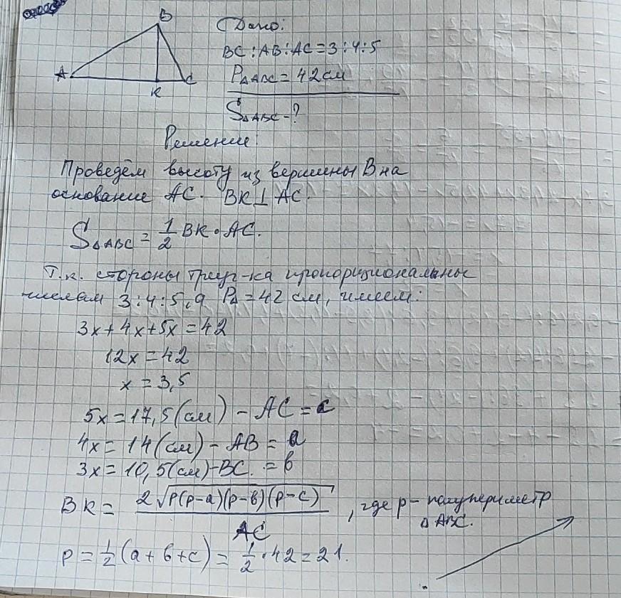 5. Стороны прямоугольного треугольника пропорци- ональны числам 3, 4 и 5. Его периметр равен 42 см. Най- дите площадь этого треугольника.