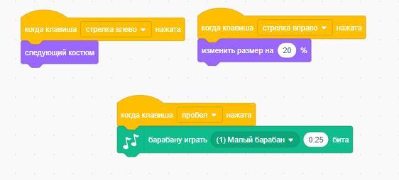 Клавиши при которых происходит действие находим в "События", образы и размеры в "Внешний вид", а для барабана выбираем дополнительный блок (их можно найти кнопкой слева снизу) "Музыкальные инструменты", они самые первые стоят