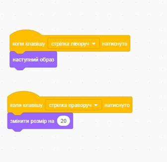 Складіть проект, у якому виконавець змінить свій образ, якщо натиснуто клавішу стрілка вліво, збільшить свій розмір на 20, якщо натиснуто клавішу стрілка вправо, або зіграє звук на ба-рабані, якщо натиснуто клавішу пропуск.(скретч)