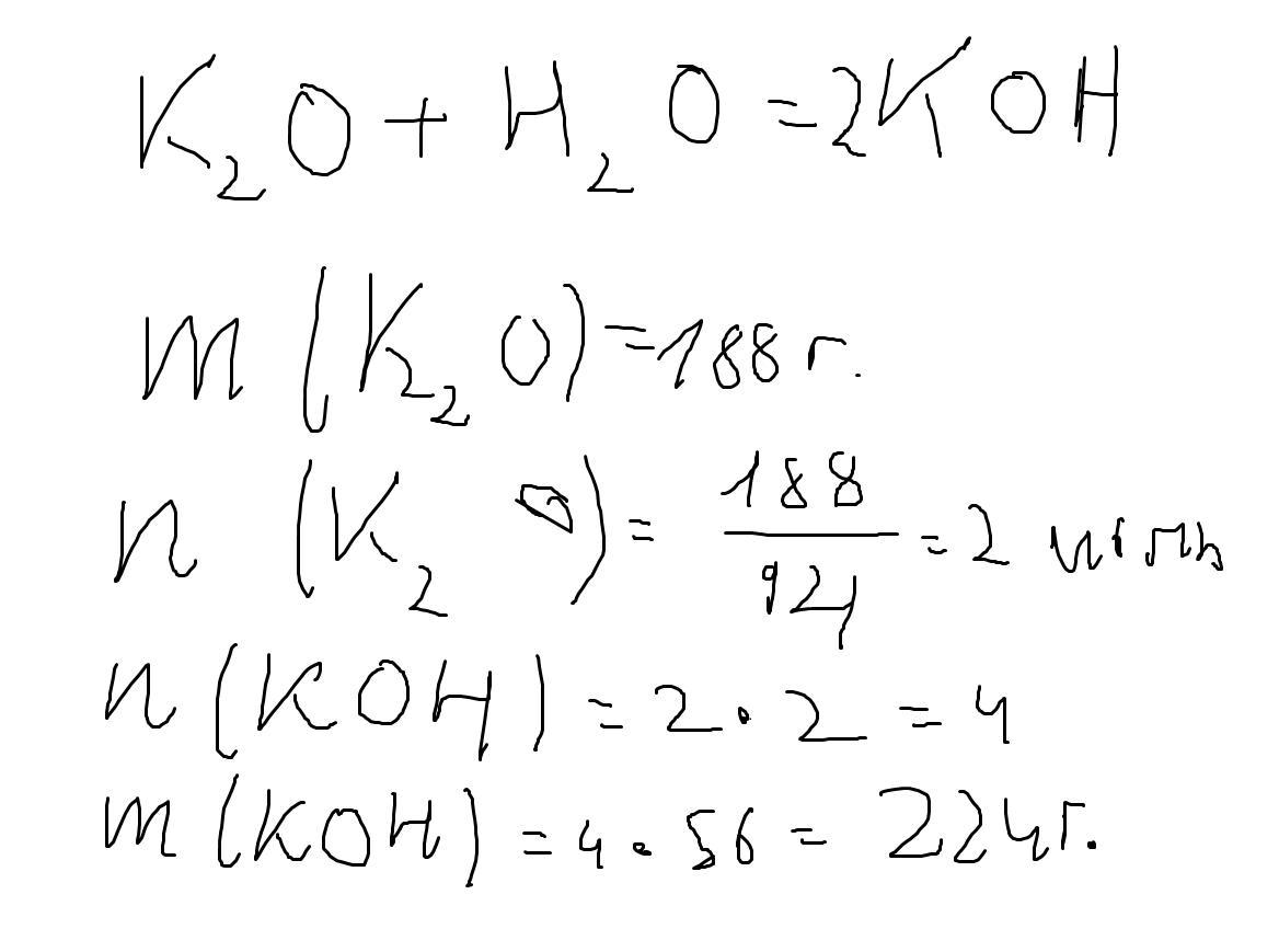 Визначити масу калій гідроксиду, що утворюється при взаємодії калій оксиду масою 188 г із достатньою кількістю води.