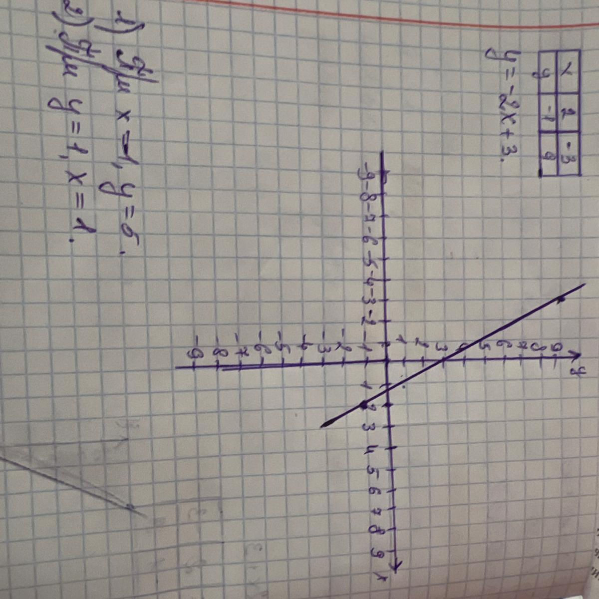 Побудуйте графік функції у =-2x + 3 Користуючися графіком, знайдіть: 1) значення функції при x = -1; 2) значення аргументу, при якому у = 1