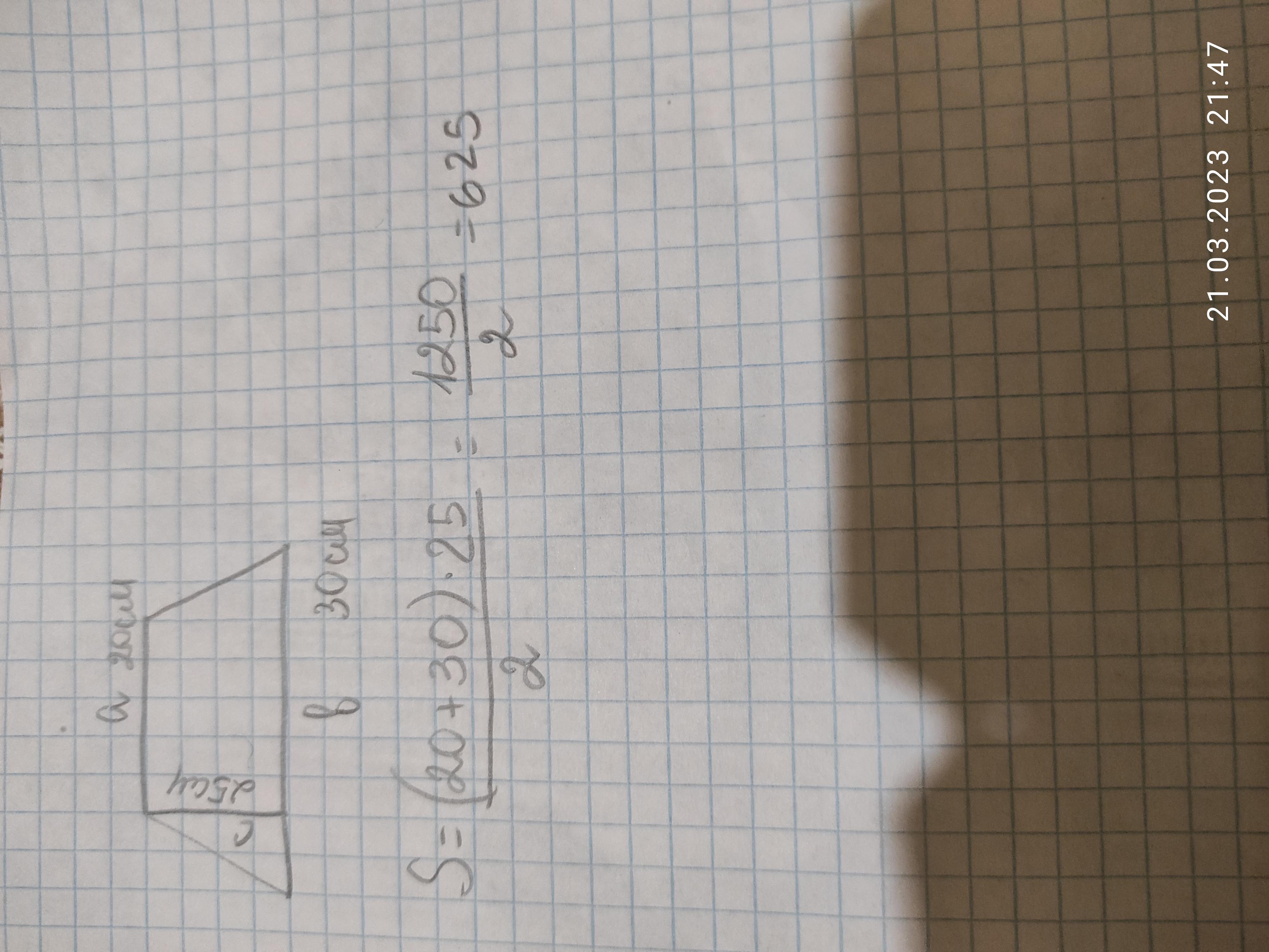 1. Дитячий майданчик має форму трапеції, паралельні сторони якої становлять 20 м і 30 м. Перпендикулярно до паралельних сторін майданчика прокладено велосипедну доріжку довжиною 25 м. Знайдіть площу дитячого майданчика.
