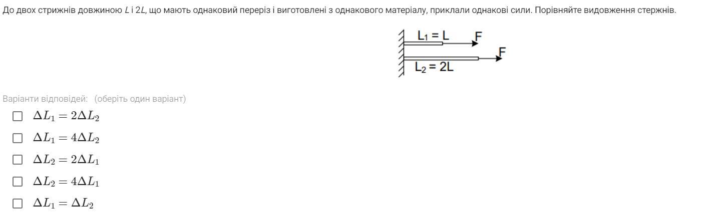 До двох стрижнів довжиною L i 2L, що мають однаковий переріз і виготовлені з однакового матеріалу, приклали однакові сили. Порівняйте видовження стержнів.