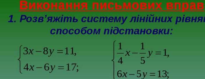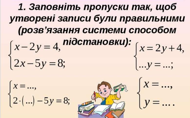 1. Заповніть пропуски так , щоб утворені записи були правильними ( розв’язання системи способом пiдстановки 2Розв'яжіть систему лінійних рівня способом підстановки :( фото)