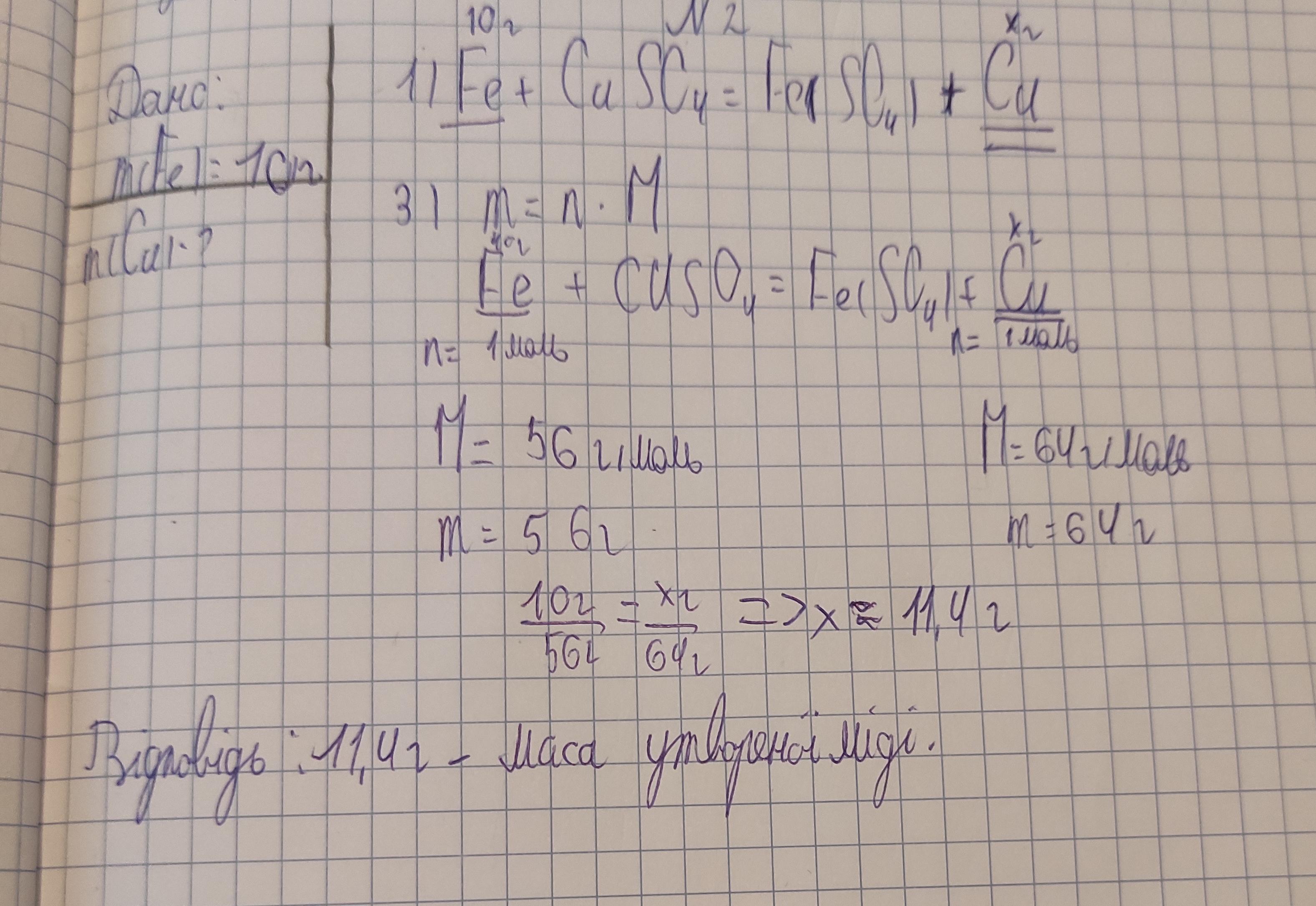 Залізну пластинку масою 10г занурили в розчин купрум (ІІ) сульфату. З часом залізна пластинка покриваєсьтся досить щільним шаром порошку міді. Яка маса утворененої міді.