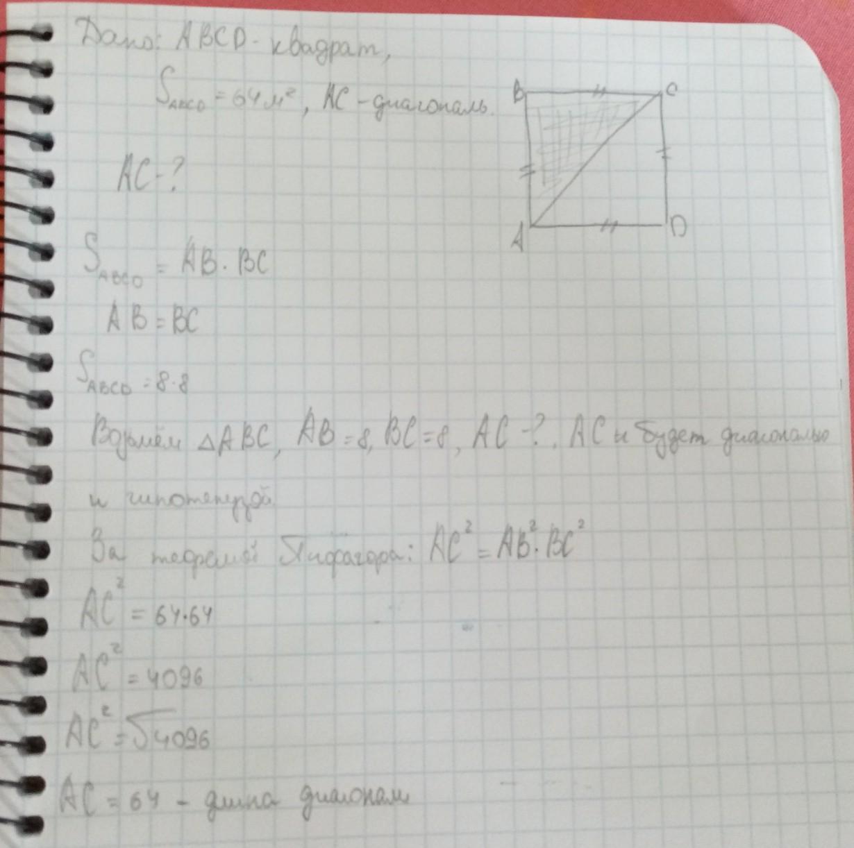 Площадь квадрата 64м2. Вычислить расстояние от точки пересечения диагонали до стороны квадрата. (с чертежом)