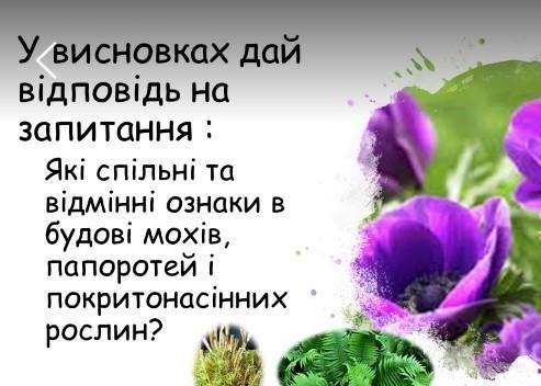 відмінні риси:мохи та папороті розмножуються за допомогою спор ,а покритонасінні-за допомогою насіння