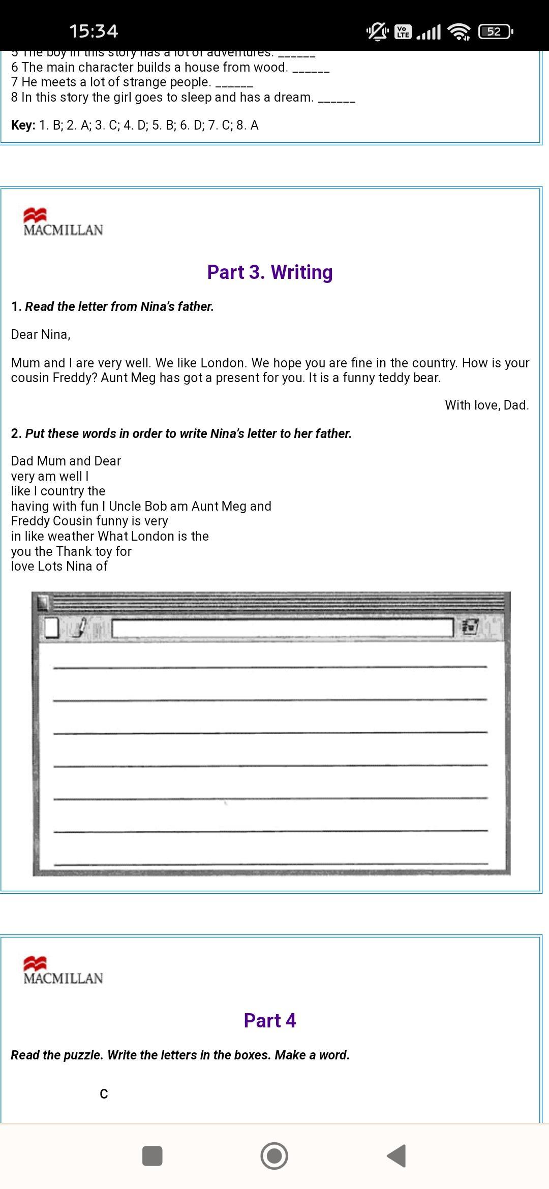 I am very well. I like the country. I am having fun with Uncle Bob and Aunt Meg. Cousin Freddy is very funny. What is the weather in London? Thank you for the toy.