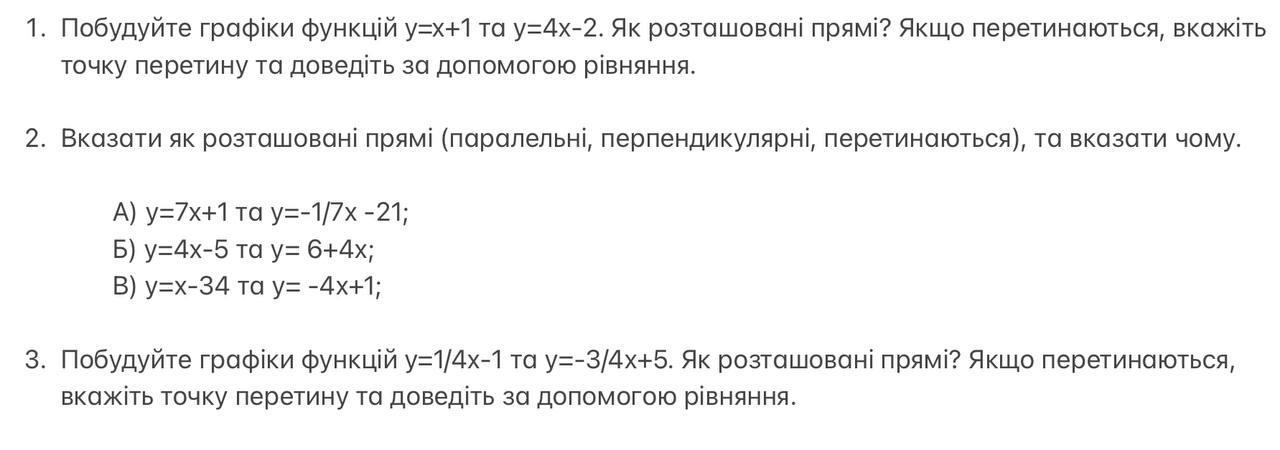 В) Прямi y=x-34 та y=-4х+1 перетинаються. Це можна побачити з того що коефiцiенти при x не рiвнi.