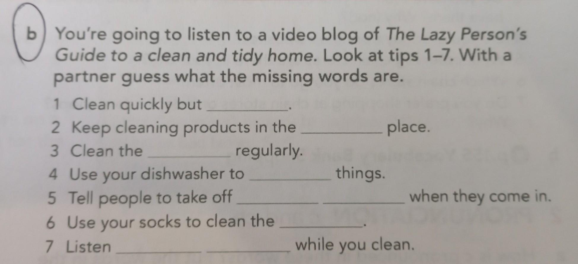 b) You're going to listen to a video blog of The Lazy Person's Guide to a clean and tidy home. Look at tips 1-7. With a partner guess what the missing words are. 1 Clean quickly but 2 Keep cleaning products in the 3 Clean the regularly. 4 Use your dishwasher to 5 Tell people to take off 6 Use your socks to clean the 7 Listen place. things. when they come in. while you clean.