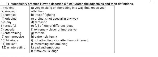 1) Vocabulary practice How to describe a film? Match the adjectives and their definitions. 1) violent a) very exciting or interesting in a way that keeps your attention 2) moving b) lots of fighting 3) complex 4) gripping c) ordinary; not special in any way d) fantastic 5) funny 6) dreadful e) full of lots of different ideas 7) superb 8) entertaining 9) unimpressive 10) hilarious 11) brilliant 12) uninteresting f) extremely clever or impressive g) terrible h) extremely funny i) not attracting your attention or interest j) interesting and amusing k) sad and emotional 1) it makes us laugh Срочноо