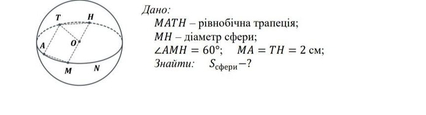 У велике коло сфери вписана рівнобічна трапеція МАТН, основа якаï МН діаметром великого кола. Обчисліть площу сфери, якщоZAMH = 60°, МА = 2 см.