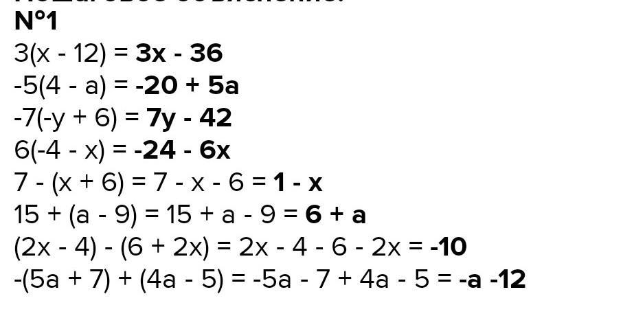 1. Розкрити дужки 3(x-12) -5(4-a) -7(-y+6) 6(-4-x) 7-(x+6) 15+(a-9) (2x-4)-(6+2x) -(5a+7)+(4a-5) 2. Розв'язати рівняння 2x-5=x+4 17-3x=-x+11 11-8(x-1)=5x+12 6-(2x+3)=6(2-x)