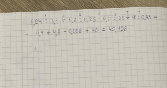 первым действием мы всегда делаем деление или умножение , дальше уже минус или плюс, циферки над примером это последовательность, того как нужно решать этот пример