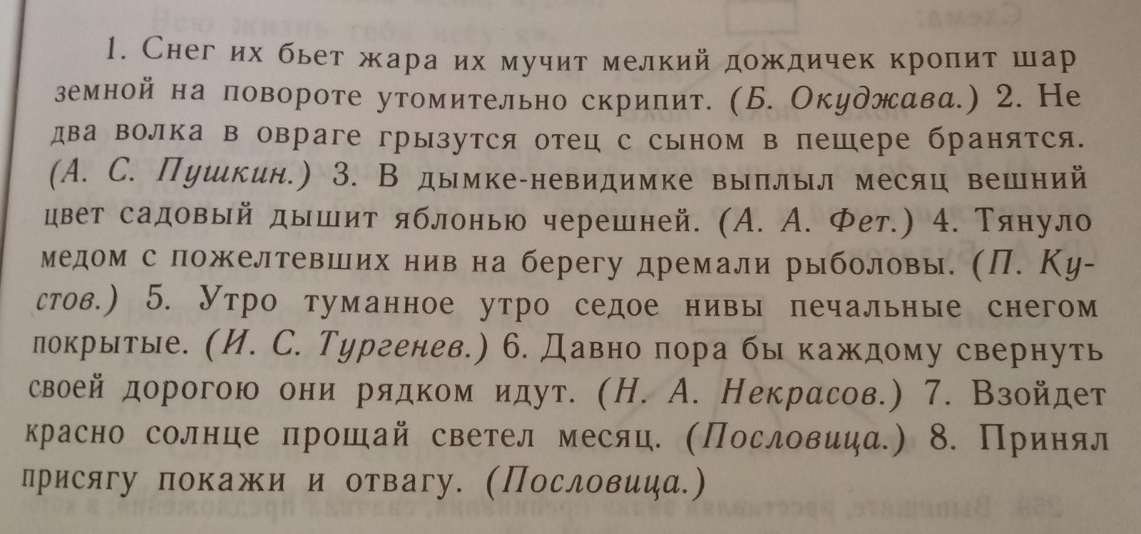 Объяснение: 1. Снег их бьет, жара их мучит, мелкий дождичек кропит шар земной, на повороте утомительно скрипит. (Б.Окуджава.)