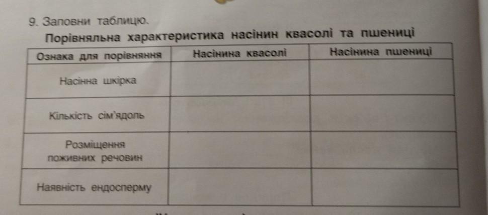 8. Заповни таблицю. Порівняльна характеристика насінин квасолі та пшениці Насінина пшениці Ознака для порівняння Насінина квасолі Наства шкiрка Кількість сім'ядоль Розміщення поживних речовин Наявність ендосперму. СМОТРИТЕ ФОТО