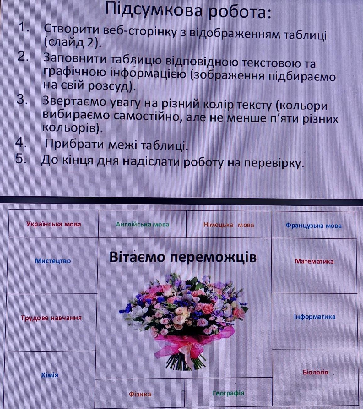 Підсумкова робота: 1. Створити веб-сторінку з відображенням таблиці (слайд 2). 2. Заповнити таблицю відповідною текстовою та графічною інформацією (зображення підбираємо на свій розсуд). 3. Звертаємо увагу на різний колір тексту (кольори вибираємо самостійно, але не менше п'яти різних кольорів). Прибрати межі таблиці. 4. 5. До кінця дня надіслати роботу на перевірку.