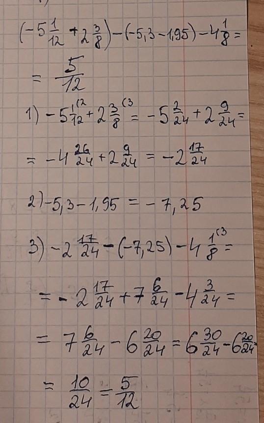 1) -5 1/12 + 2 3/8 = -5 2/24 + 2 9/24 = -4 26/24 + 2 9/24 = -2 17/24