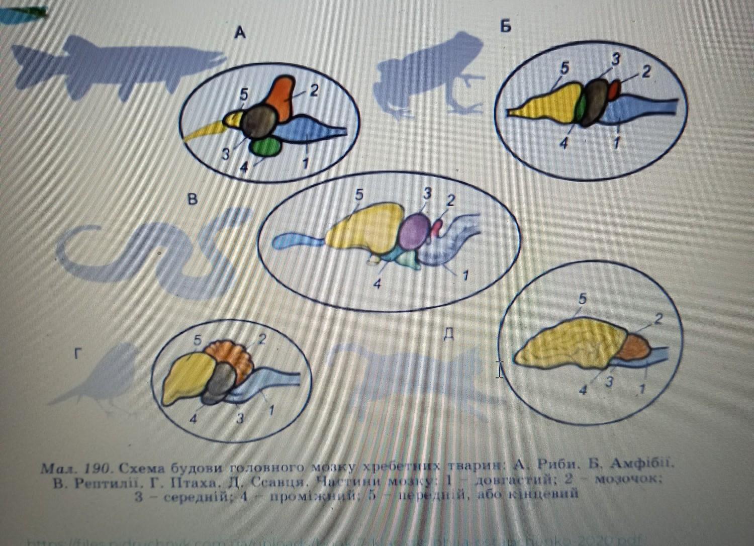 Розгляньте малюнок головного мозку риб. Знайдіть передній, про- міжний, середній, довгастий мозок і мозочок. Визначте, які з цих ча- стин головного мозку розвинені краще.