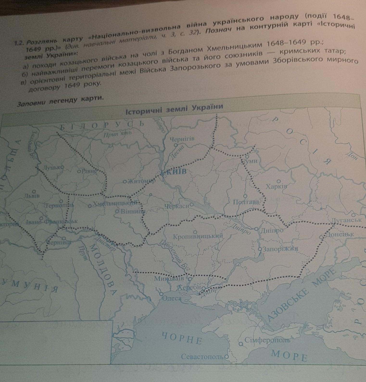 1.2. Розглянь карту «Національно-визвольна війна українського народу (події 1648- 1649 рр.)» (див. навчальні матеріали, ч. 3, с. 32). Познач на контурній карті «Історичні землі України»: а) походи козацького війська на чолі з Богданом Хмельницьким 1648–1649 рр.; найважливіші перемоги козацького війська та його союзників кримських татар; б) в) орієнтовні територіальні межі Війська Запорозького за умовами Зборівського мирного договору 1649 року. -