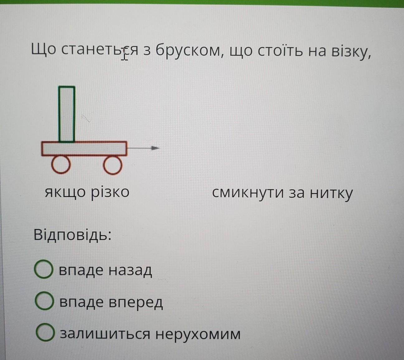 Що станеться з бруском, що стоїть на візку, якщо різко смикнути за нитку.