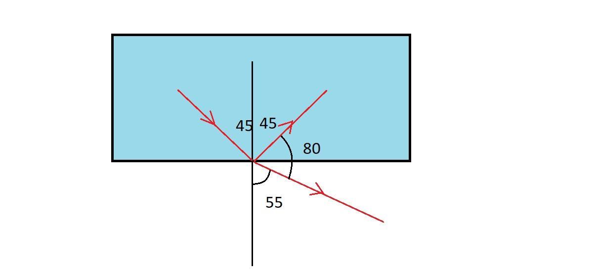 Помогите пожалуйста выполнить задание- Угол между отраженным лучом и преломленным составляет 80°, а угол преломления 55°. Найдите угол падения света и относительный показатель преломления среды. Сделайте пояснительный рисунок.