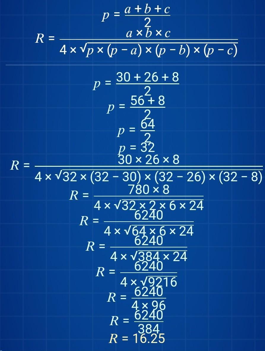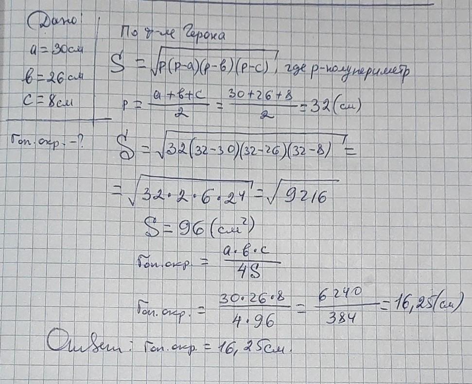 Знайдіть радіус описаного кола для трикутника, сторони якого дорівнюють 30см,26см і 8см