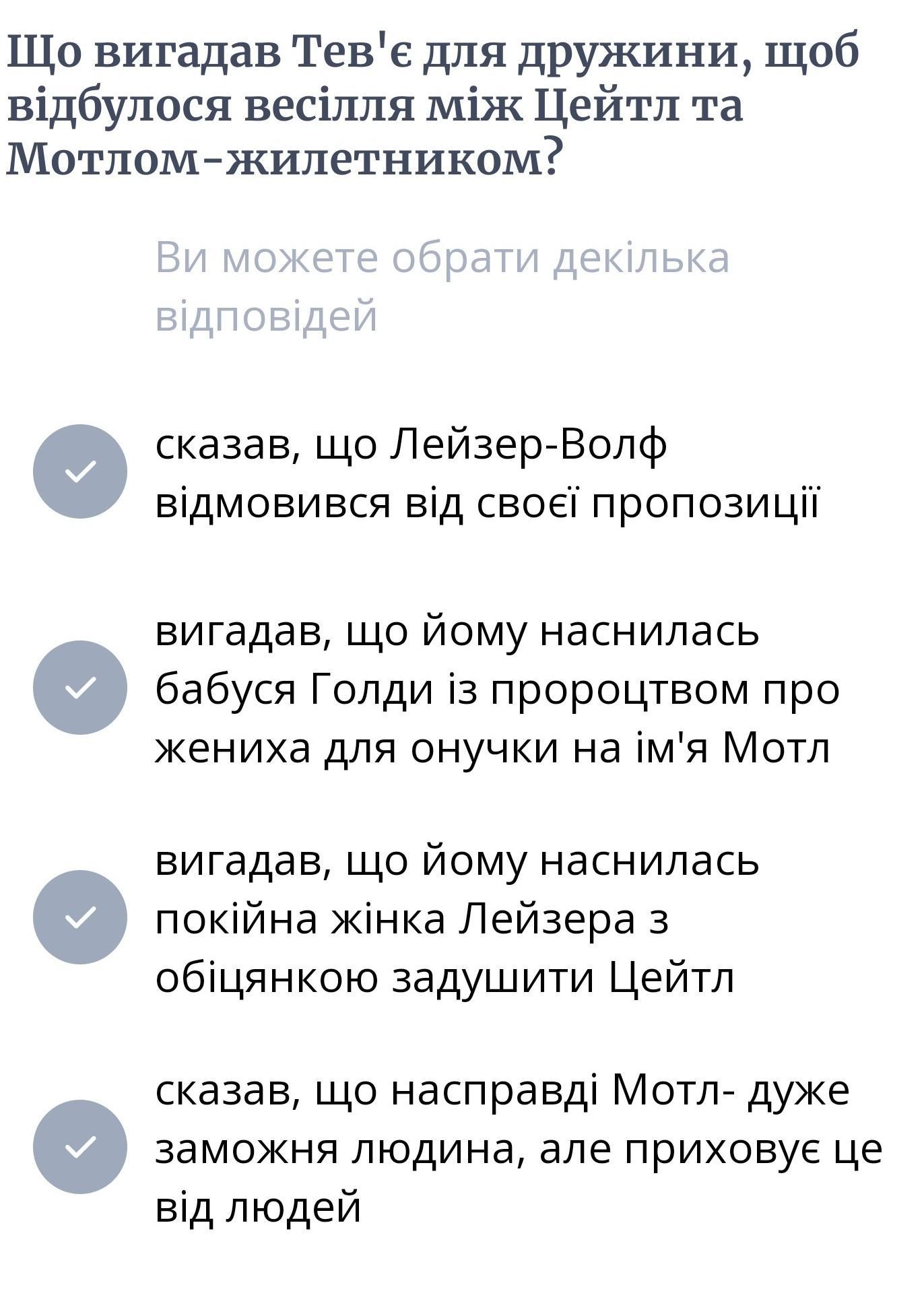 Що вигадав Тев'є для дружини, щоб відбулося весілля між Цейтл та Мотлом-жилетником? Ви можете обрати декілька відповідей сказав, що Лейзер-Волф відмовився від своєї пропозиції