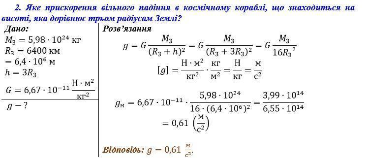 Яке прискорення вільного падіння в космічному кораблі, що знаходиться на висоті, яка дорівнює чотирьом радіусам Землі?