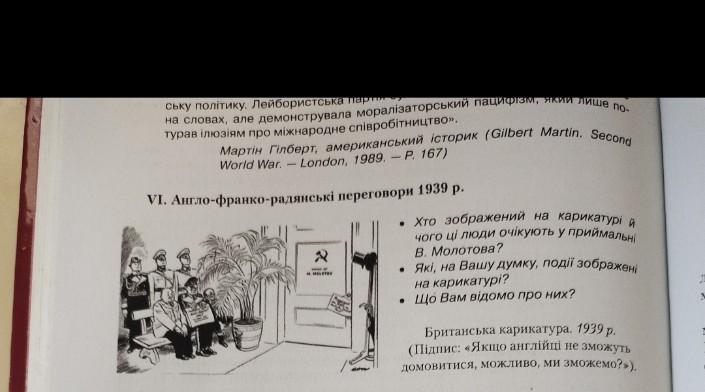 1) На карикатурі зображені Володимир Молотов - міністр закордонних справ Радянського Союзу, Невіль Чемберлен - тодішній прем'єр-міністр Великої Британії, Едуард Даладьє - міністр закордонних справ Франції, та Адольф Гітлер - нацистський диктатор Німеччини. Ці люди очікують у приймальні Молотова.