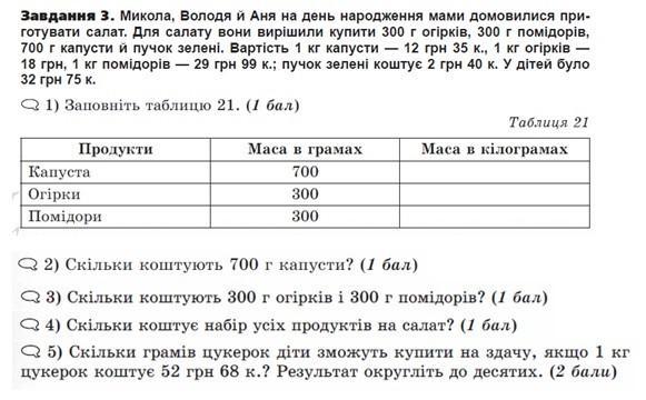 Микола, Володя й Аня на день народження мами домовилися приготувати салат. Для салату вони вирішили купити 300 г огірків, 300 г помідорів, 700 г капусти й пучок зелені. Вартість 1 кг капусти- 12 грн 35 коп., 1 кг огірків- 18 грн, 1 кг помідорів -29 грн 99 коп.; пучок зелені коштує 2 грн 40 к. У дітей було 32 грн 75 коп