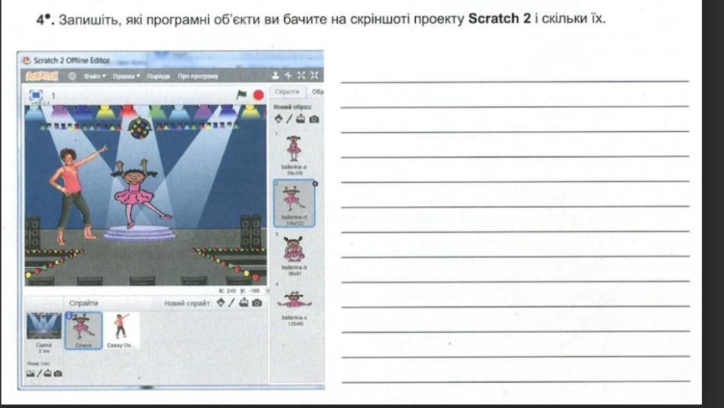 4. Запишіть, які програмні об'єкти ви бачите на скріншотi проекту Scratch 2 і скільки їх. срочно!!!!