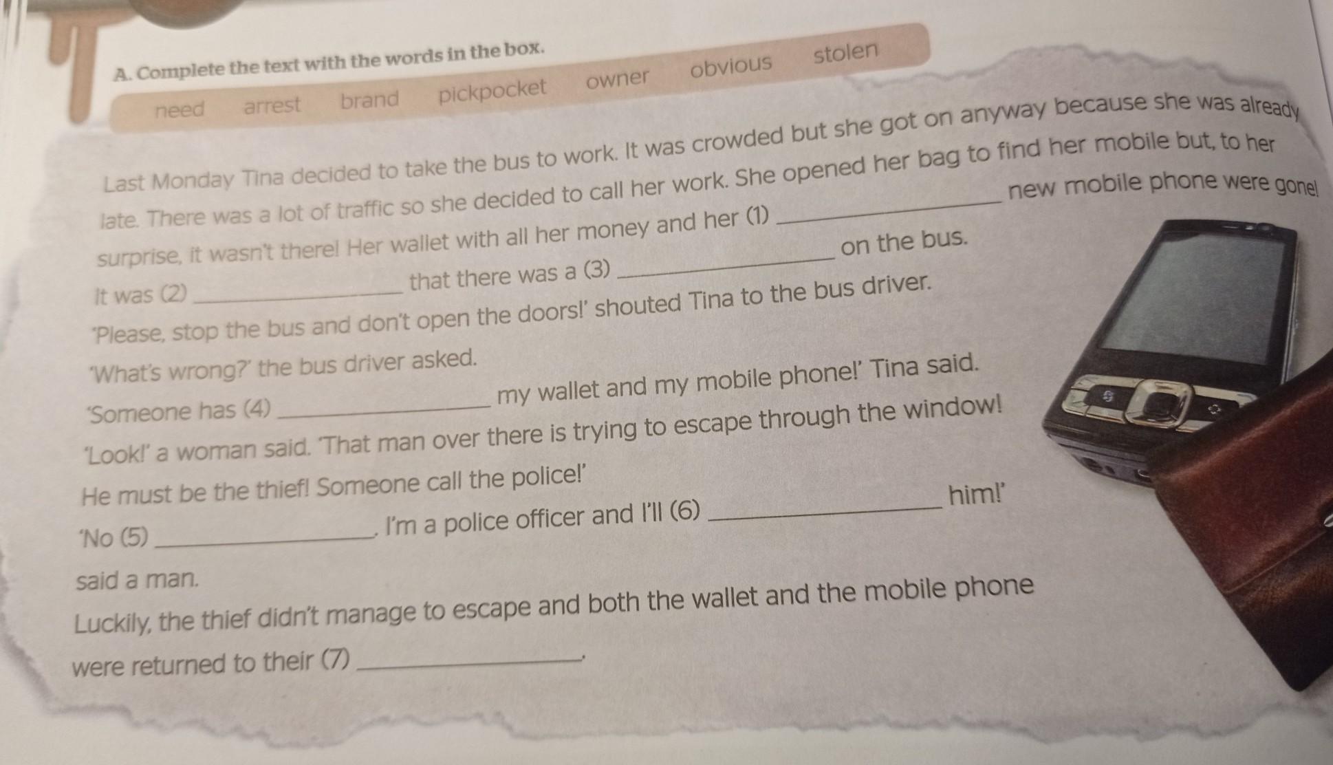 A. Complete the text with the words in the box. arrest brand need pickpocket stolen obvious owner Last Monday Tina decided to take the bus to work. It was crowded but she got on anyway because she was already new mobile phone were gonel late. There was a lot of traffic so she decided to call her work. She opened her bag to find her mobile but, to her surprise, it wasn't there! Her wallet with all her money and her (1) It was (2) that there was a (3) on the bus. Please, stop the bus and don't open the doors!' shouted Tina to the bus driver. What's wrong?' the bus driver asked. 'Someone has (4) my wallet and my mobile phonel' Tina said. "Look!' a woman said. That man over there is trying to escape through the window! He must be the thief! Someone call the policel' 'No (5) I'm a police officer and I'll (6) him!' said a man. Luckily, the thief didn't manage to escape and both the wallet and the mobile phone were returned to their (7)