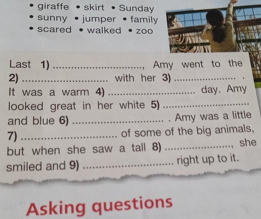 Last 1)....... 2) ......... It was a warm 4)........... looked great in her white 5) and blue 6)... 7)......... but when she saw smiled and 9)...... Amy went to the with her 3)....... day. Amy Amy was a little of some of the big animals, a tall 8) she ....... right up to it.