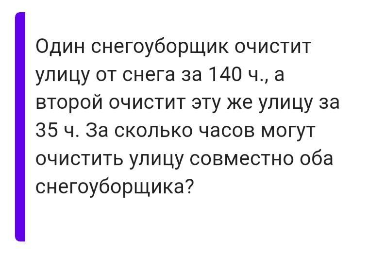 Один снегоуборщик очистит улицу от снега за 140 ч., а второй очистит эту же улицу за 35 ч. За сколько часов могут очистить улицу совместно оба снегоуборщика?