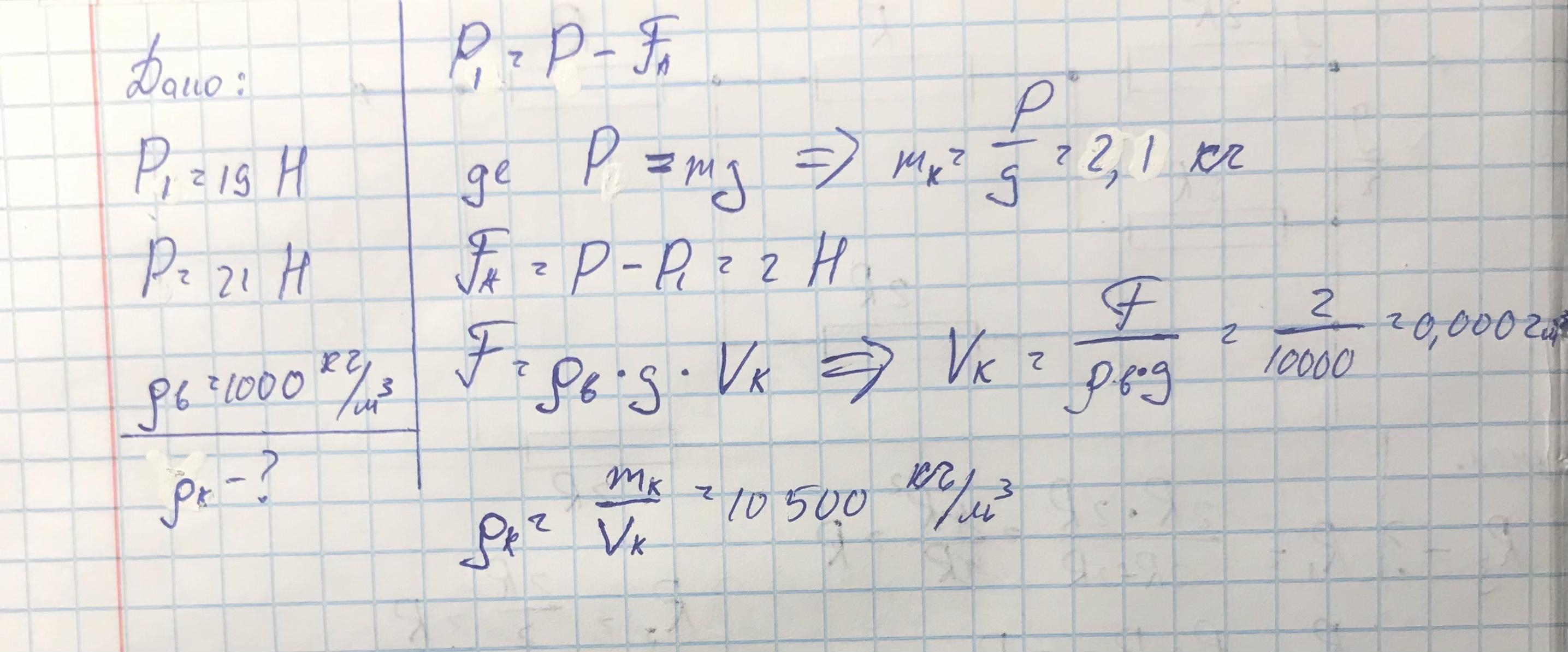 СРОЧНО, ДАЮ 30 БАЛІВ!!! Під час лабораторної роботи учні опускали у воду невеликий кубик. Кубик плавав всередині рідини. За допомогою динамометра діти визначили, що його вага у повітрі становить 21 н. а у воді - 19 Н. Визначте густину кубика. (Густина води становить 1000 кг/м³, g = 10 Н/кг).