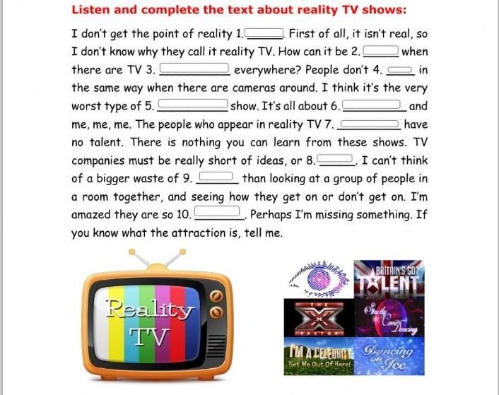 I don’t get the point of reality TV. First of all, it isn’t real, so I don’t know why they call it reality TV. How can it be real when there are TV cameras everywhere? People don’t act in the same way when there are cameras around. I think it’s the very worst type of television show. It’s all about celebrity and me, me, me. The people who appear in reality TV shows have no talent. There is nothing you can learn from these shows. TV companies must be really short of ideas, or money. I can’t think of a bigger waste of time than looking at a group of people in a room together, and seeing how they get on or don’t get on. I’m amazed they are so popular. Perhaps I’m missing something. If you know what the attraction is, tell me.