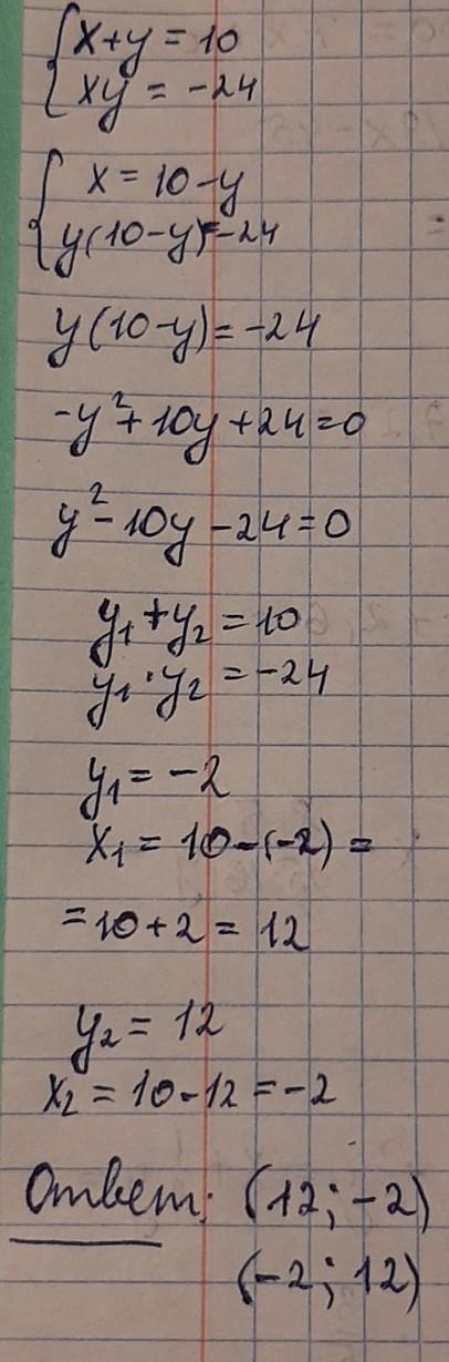 (10-у)*у=-24; 10у-у²+24=0; у²-10у-24=0; за теоремою Вієта у=-2; у=12.