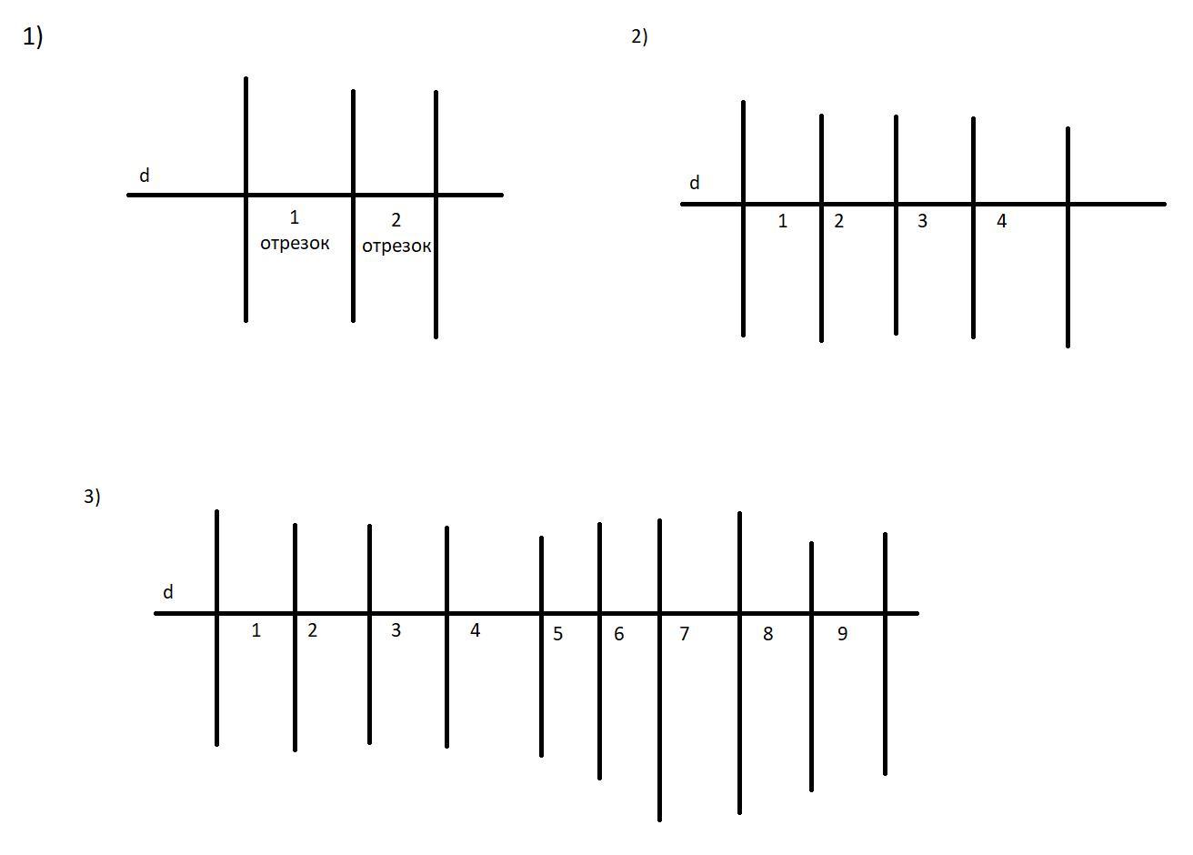 дам 50 БАЛЛОВ ПОМОГИТЕ ПЖЖЖЖЖ!!!!! при пересечении прямой d двумя параллельными прямыми образуется один отрезок. Сколько отрезков образуется, если прямая d пересечет: 3 параллельные прямые ,5 параллельных, прямых 10 параллельных прямых