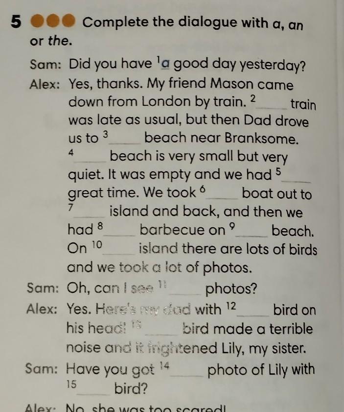 5 Complete the dialogue with a, an or the. Sam: Did you have a good day yesterday? Alex: Yes, thanks. My friend Mason came down from London by train. 2 train was late as usual, but then Dad drove us to beach near Branksome. 3 4 beach is very small but very quiet. It was empty and we had 5 great time. We took 6 boat out to 7 island and back, and then we barbecue on 9 beach. had 8 On 10 and we took a lot of photos. island there are lots of birds Sam: Oh, can I see !! photos? Alex: Yes. Here's my dad with 12 his head! 13 bird on bird made a terrible noise and it frightened Lily, my sister. photo of Lily with Sam: Have you got 15 bird? Alex: No, she was too scared!
