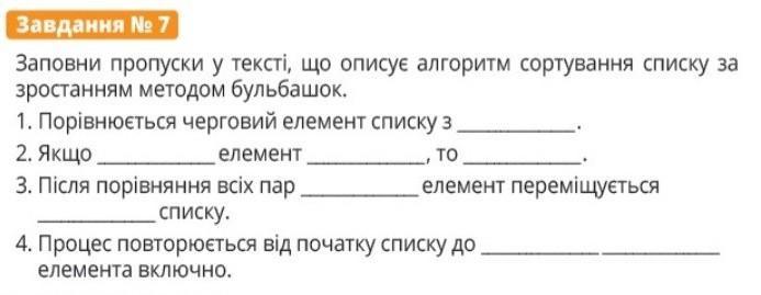 Заповни пропуски у тексті, що описує алгоритм сортування списку за зростанням методом бульбашок.