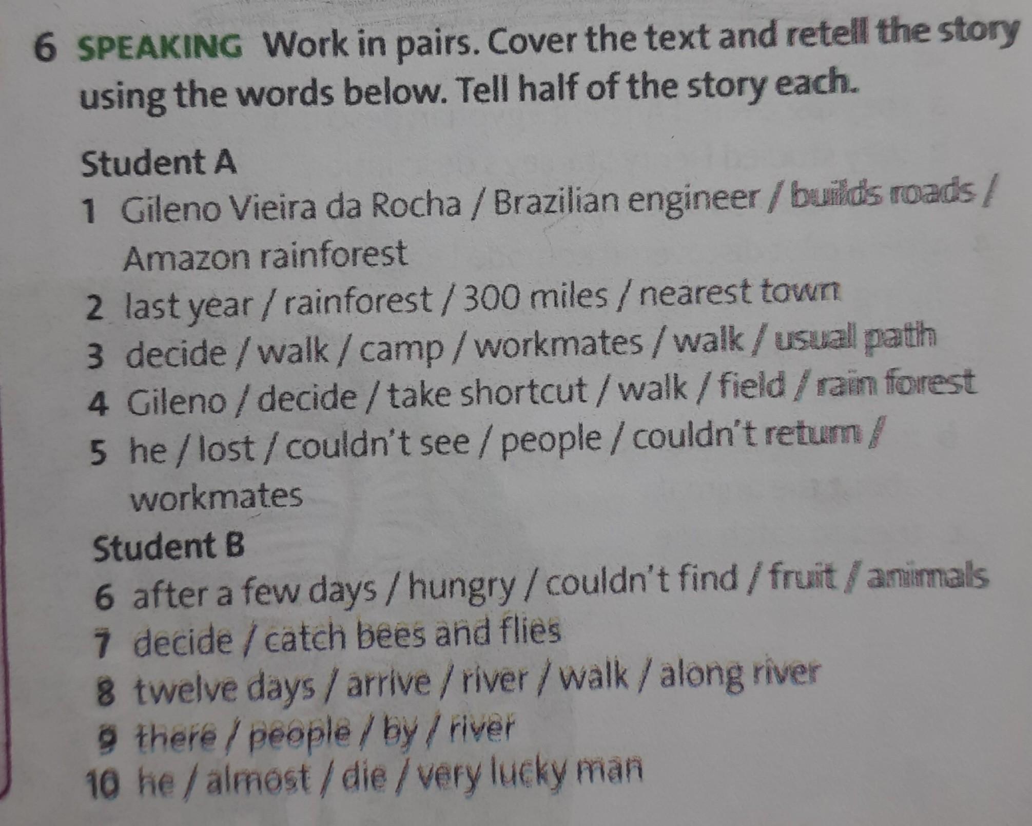 6 SPEAKING Work in pairs. Cover the text and retell the story using the words below. Tell half of the story each. Student A 1 Gileno Vieira da Rocha / Brazilian engineer /builds roads/ Amazon rainforest 3 2 last year/rainforest / 300 miles / nearest town decide/walk/camp/workmates/walk/usuall path 4 Gileno / decide /take shortcut /walk/field/rain forest 5 he/lost/couldn't see /people/couldn't return/ workmates Student B 6 after a few days / hungry/couldn't find / fruit/animals 7 decide / catch bees and flies 8 twelve days / arrive / river / walk / along river 9 there/people/by/river 10 he/almost/die/very lucky man
