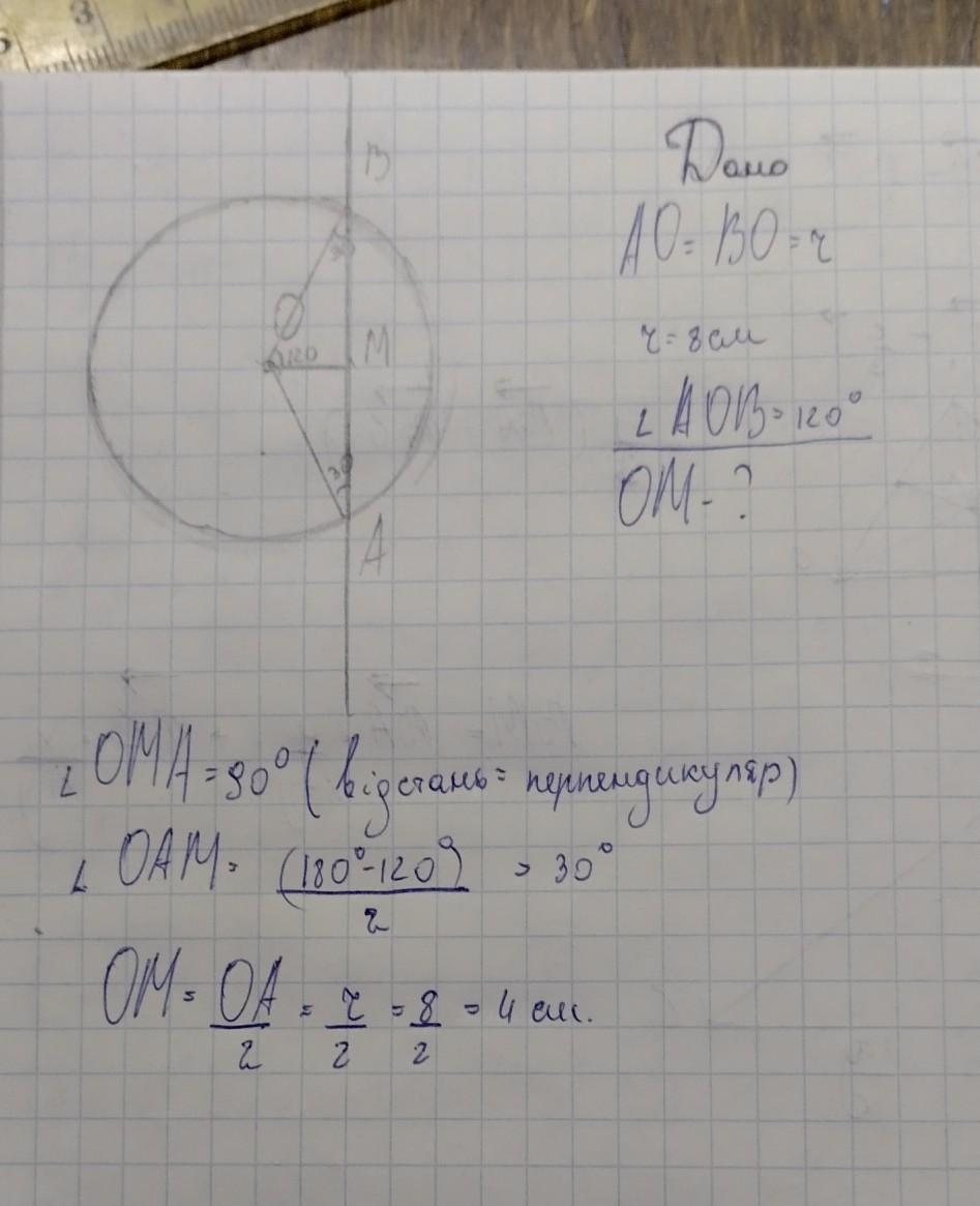 Тоді кут АМО - прямий, а кут АОМ - 60 гр. Тоді кут ОАМ=90-60=30. ОА - гіпотенуза - радіус - 8см. За теоремою, сторона що лежить проти кута 30гр. у два рази менша за гіпотенузу. А сторона що лежить проти кута ОАМ... і є наша відстань, яка дорівнюе 1/2АО - 8:2 - 4см.