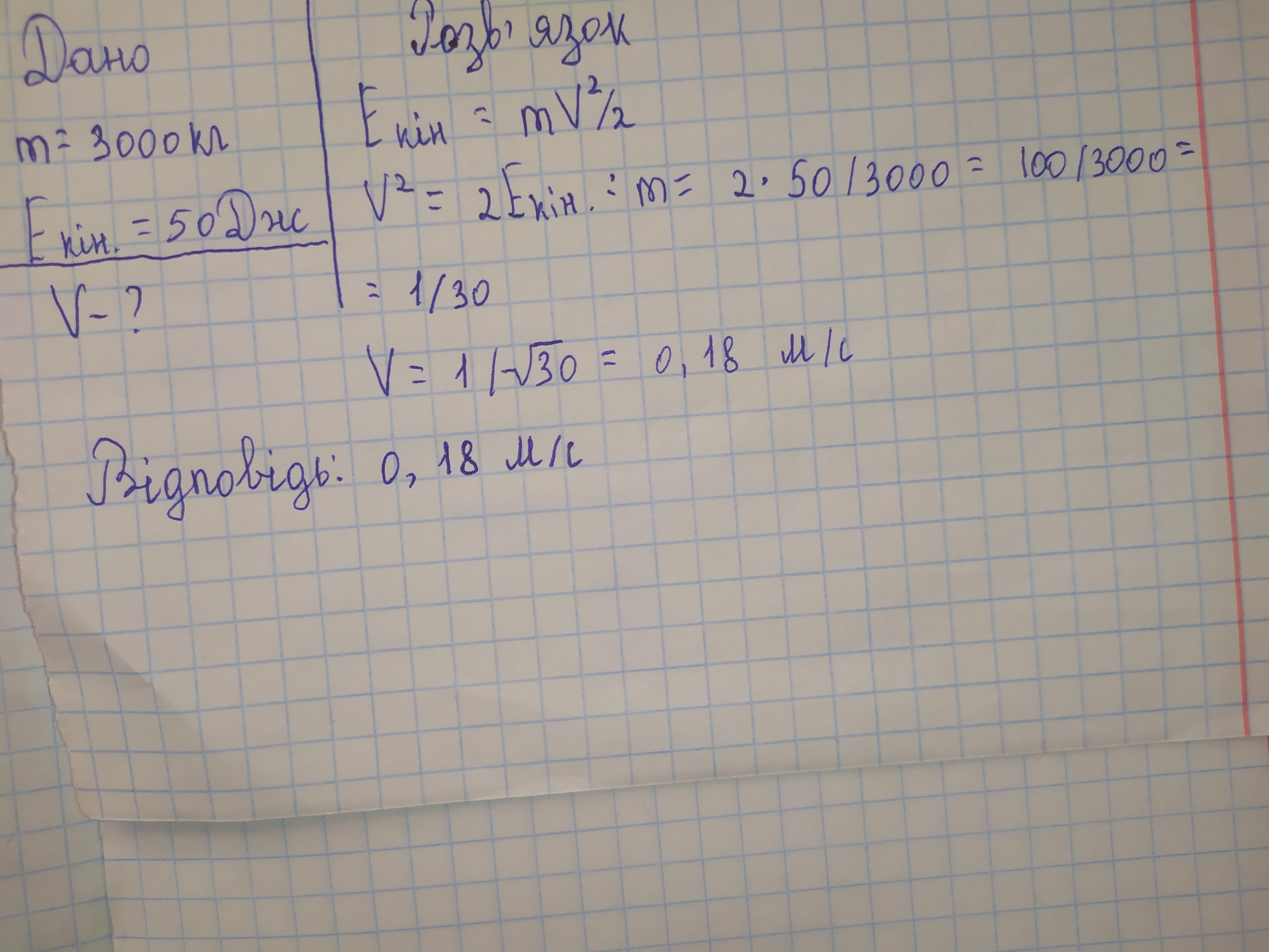 Дано: m=3000 кг; Екин=50 Дж; V - ? Екин=mV²/2. V²=2Екин/m=2*50/3000=1/30;