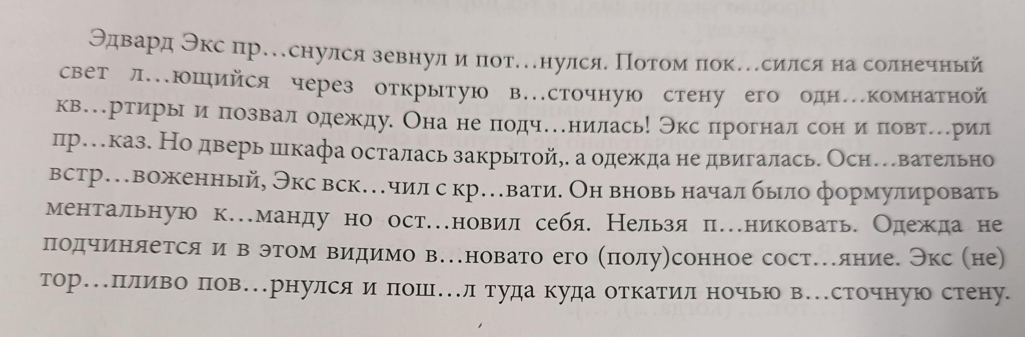 Эдвард Экс проснулся (=), зевнул (=) и потянулся (=, однородные). Потом покос`ился (к`осо) на солнечный свет×, льющийся через открытую вост`очную стену его однокомнатной кварт`иры (п/о), и позвал одежду. Она не подчин`илась! Экс прогнал сон и повтор`ил (вт`орить) прик`аз. Но дверь шкафа осталась закрытой, а одежда не двигалась. Основ`ательно (осн`ова) встревоженный (п/о со значением причины), Экс× вскоч`ил с кров`ати. Он вновь начал (=) было формулировать ментальную ком`анду, но остановил (=, однородные) себя. Нельзя паников`ать (п`аника). [Одежда не подчиняется], и [в этом, видимо (вв. слово), винов`ато его полусонное состо`яние] (ССП). [Экс неторопл`иво (=медленно) поверн`улся и пош`ёл туда], (куда откатил ночью вост`очную стену) (СПП).