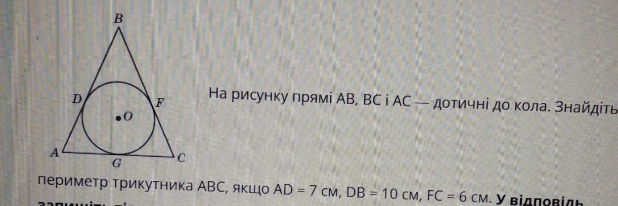 A В G F C На рисунку прямі AB, BC i AC-дотичні до кола. Знайдіть ериметр трикутника ABC, якщо AD = 7 см, DB = 10 см, FC = 6 см.