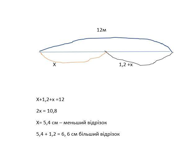 Трубу завдовжки 12 м розрізали на дві частини, одна з яких на 1,2 м довша, ніж друга. Зобразіть за допомогою відрізків умову задачі та визначте довжини кожної частини