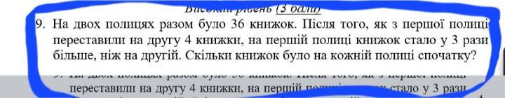 3x+x = 36 ; 4x = 36 ; x = 36:4 ; x=9 книг сейчас на второй полке ; 9 - 4 = 5книг было на второй полке первоначально ; 36 - 5 = 31книга была на первой полке первоначально