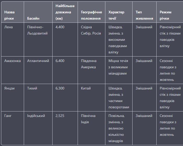 Мне нужно написать таблицу помогите пожалуйста. Нужно написать про речки из всех бассейнов: Про північно-льодовитий, про атлантичний, про тихий та індійський.